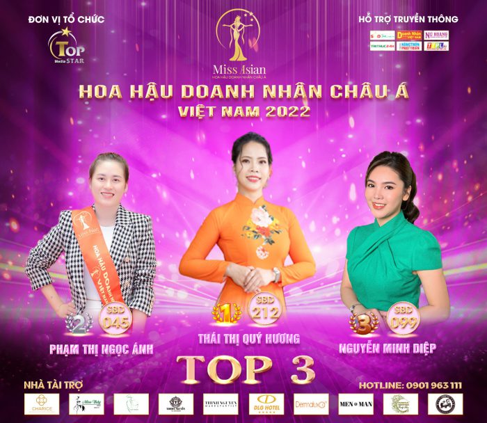 Hoa hậu Doanh nhân Châu Á Việt Nam 2022 đang trong giai đoạn nước rút. Các thí sinh đang cạnh tranh khốc liệt cho ngôi vị cao nhất trên BXH. 17h hằng ngày, BTC cuộc thi sẽ chính thức đóng cổng bình chọn và công bố số điểm gửi đến người hâm mộ.